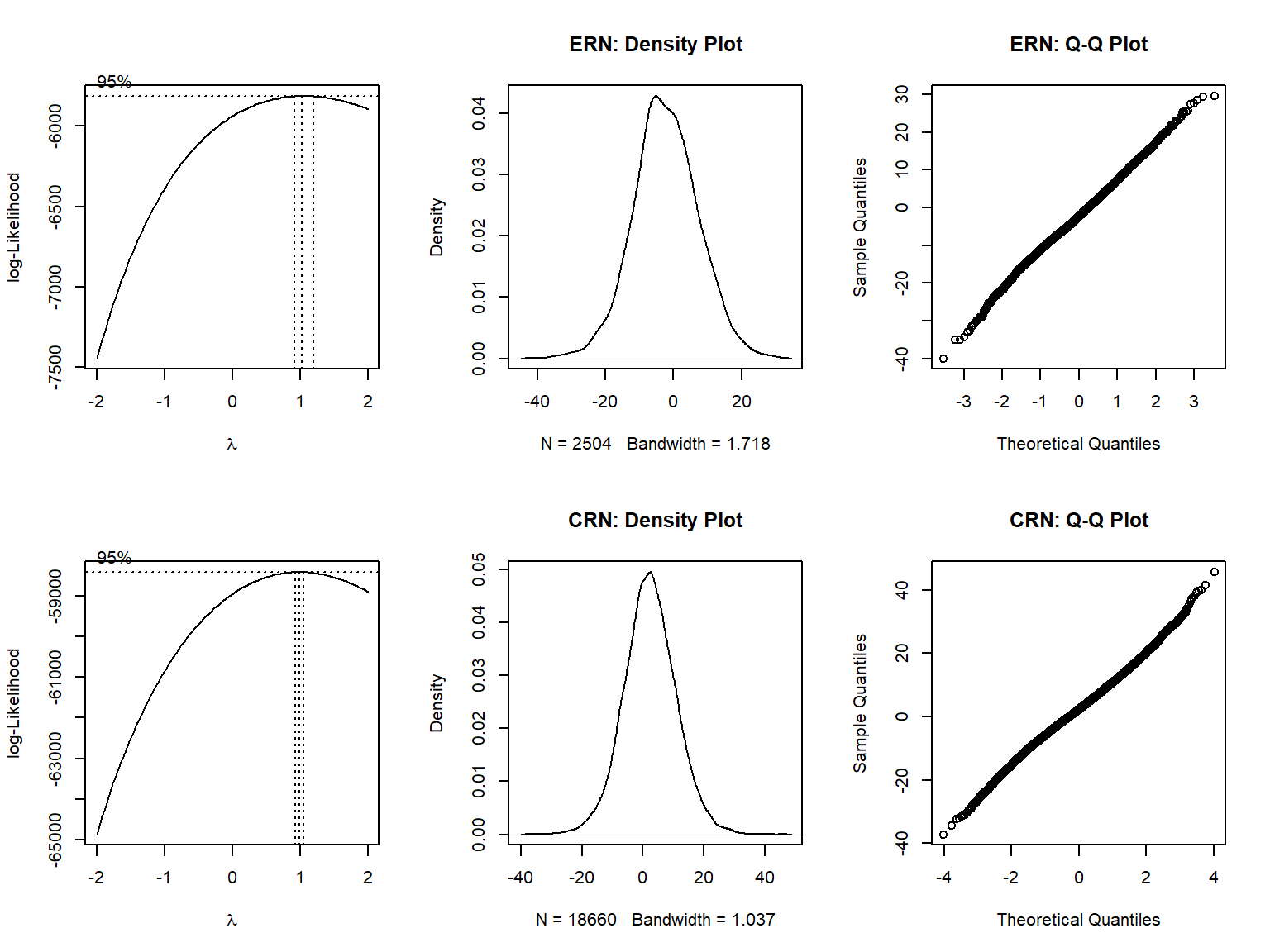 For the ERN, the optimal lambda is 1.03 (upper left plot), suggesting that no transformation is needed. For the CRN, the optimal lambda is 0.99 (lower left plot), suggesting that no transformation is needed.